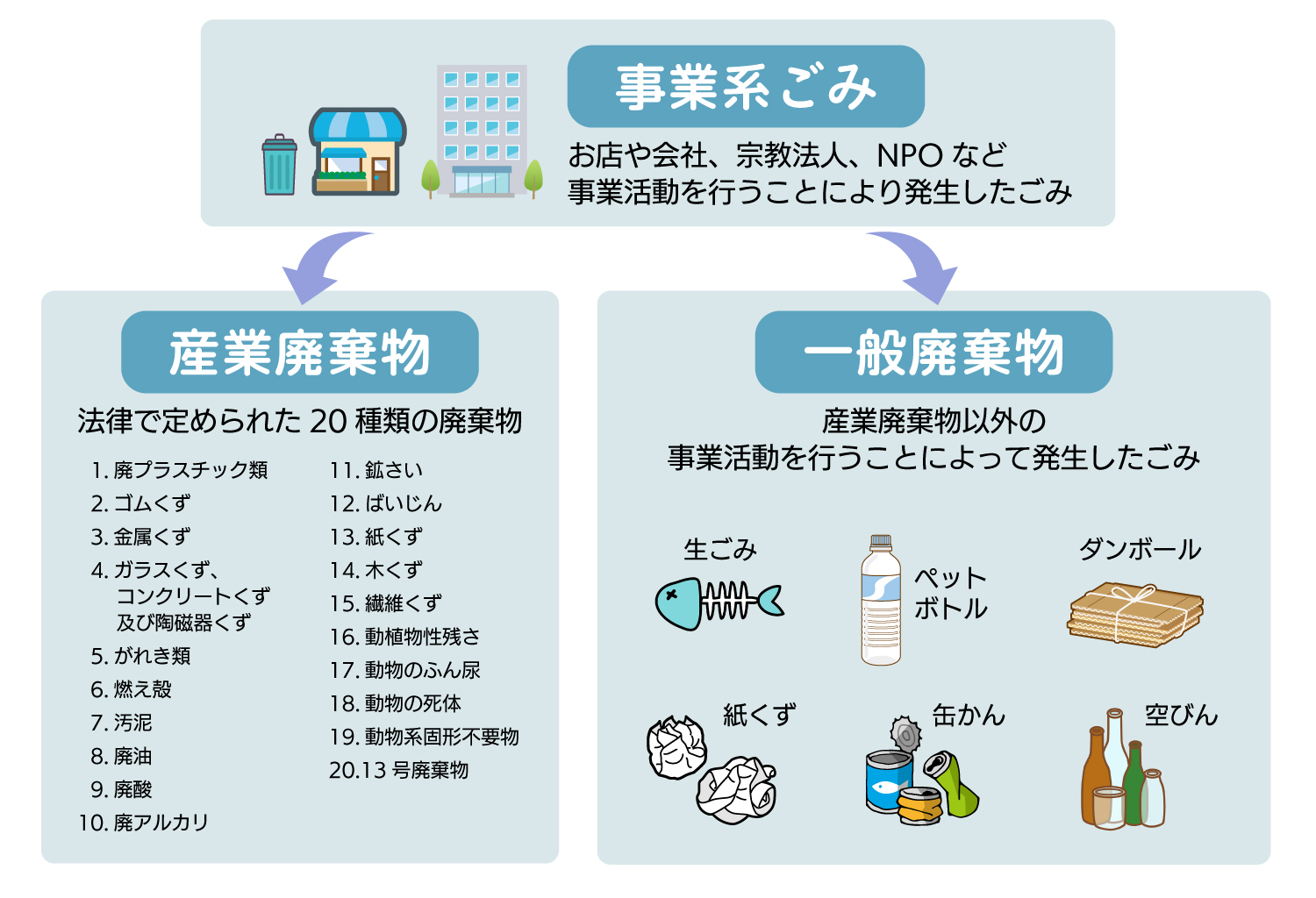 店舗や事業所などから出るごみのうち、法律で定められた20種類のごみのことを産業廃棄物と言い、収集運搬は産業廃棄物の許可を受けた業者へ依頼することが必要です。