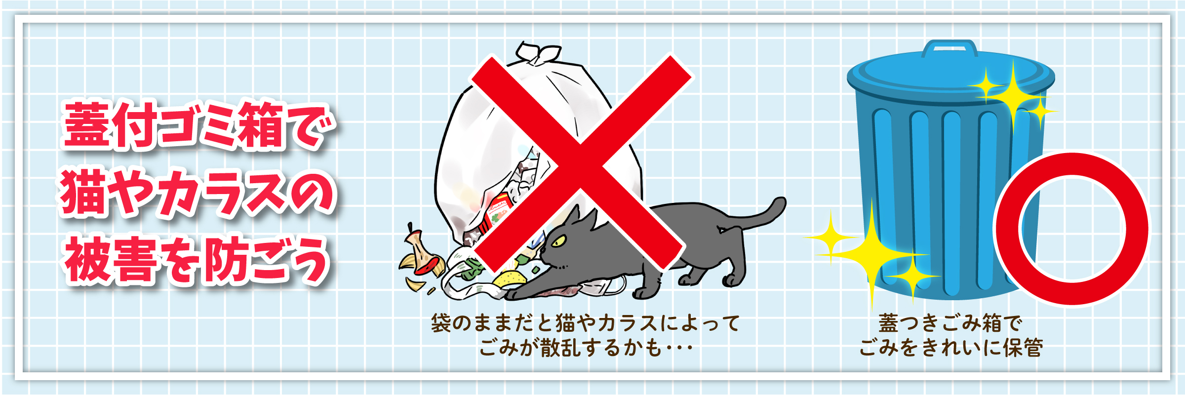 蓋付ごみ箱の使用など被害を減らす取組みへの協力をお願いします。